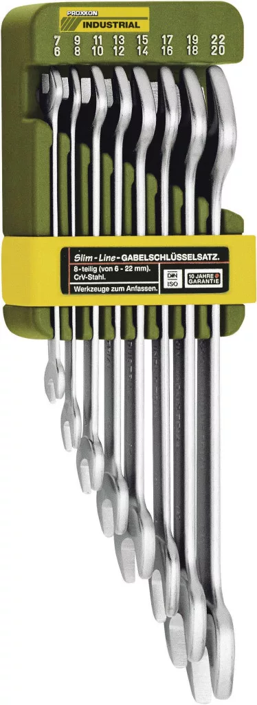 Műszaki adatok: Anyag: Króm-vanádium acél · Anyagjellemző: Nikkelezett,Krómozott,Polírozott · DIN szabvány: DIN 3110,DIN ISO 3318 · Kulcsszélesség: 6 mm,7 mm,8 mm,9 mm,10 mm,11 mm,12 mm,13 mm,14 mm,15 mm,16 mm,17 mm,18 mm,19 mm,20 mm,22 mm · Termék típus: Kettős csavarkulcs készlet · További műszaki adatok: ISO 3318