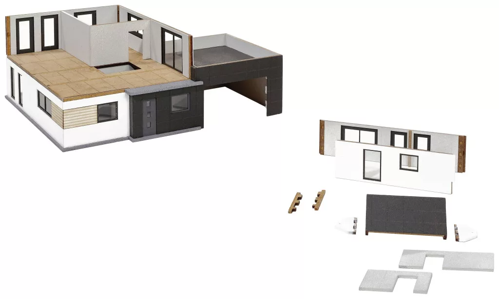 Modern előregyártott ház építés alatt, poliplate kompozitból. Nehézségi szint: 2 (haladó).