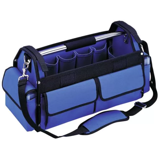 Robusztus kialakítás műanyag csúszósínekkel és fém sínnel a tetején, habszivacs fogantyúval. Állítható hordozópánt válltámaszsal. Kívül: 1 nagy, zárható zseb 2 kis alkatrész dobozzal, 9 zseb, 2 tépőzáras vízmérték rögzítésére stb., belül: 3 zseb, 14 hurok.