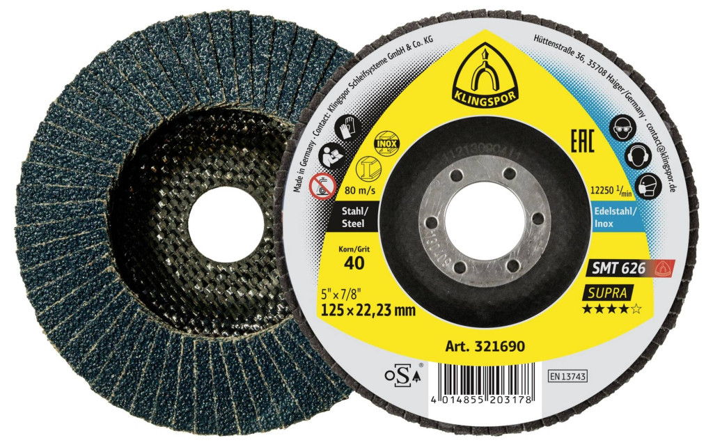 A Klingspor SMT 626 Supra csiszolólap-korongot hosszú élettartam és nagyon egyenletes csiszolási felület jellemzi. Ezt a lamella speciális, 6°-os dőlésszögének köszönhetően érik el. Ezt a professzionális szerszámot többek között acél és rozsdamentes acél megmunkálására használják, például fémmegmunkáló műhelyekben, valamint készülék- és tartálygyártásban.