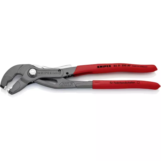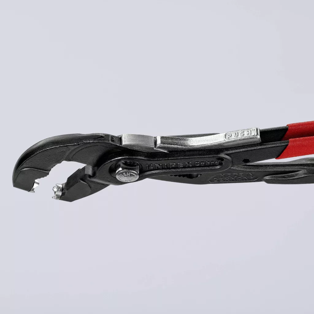 A zárószerkezet lehetővé teszi a könnyű és biztonságos munkavégzést, ha a bilincs minden erőfeszítés nélkül be van szorítva. Egykezes nyitás. Használható szabványos, helytakarékos és huzalbilincsekhez, valamint rugós szalaggyűrűkhöz 70 mm névleges méretig. Több mint 40 mm befogási út. Forgatható, univerzális markolatbetétek a bilincsek biztonságos rögzítéséhez bármilyen helyzetben. A megfogóbetétek terhelés alatt is forgathatók. Rendkívül jó kar, mellyel a bilincsek könnyen, könnyen és biztonságosan nyithatók kis erőfeszítéssel. Vékony fej. Kis fejszélesség, forgatható markolatbetétek: ideális eszköz, különösen szűkös körülmények között. Kiegészítő funkció: Óvatosan lazítsa meg a tömlőket fogazott megfogópofákkal. Króm-vanádium elektroacél, kovácsolt és olajban edzett