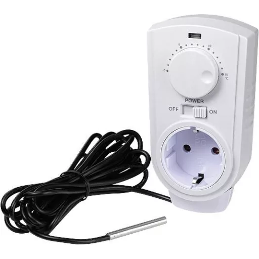 Hőmérséklet vezérelt Plug and Play dugaszolós termosztát a fűtő- és hűtő készülékek egyszerű megfigyelésére max. 3680 W-ig. A forgatógombbal manuálisan beállíthatja a kívánt bekapcsolási vagy kikapcsolási hőmérsékletet 5 ° - 30 ° C között. A külső érzékelő ennek megfelelően van elhelyezve, és figyeli a mobil termosztát hőmérsékletét. Egy optikai LED-kijelző mutatja az eszközök kapcsolási állapotát. Manuálisan a tolókapcsolóval kapcsolhatók be- illetve ki a készülékek.