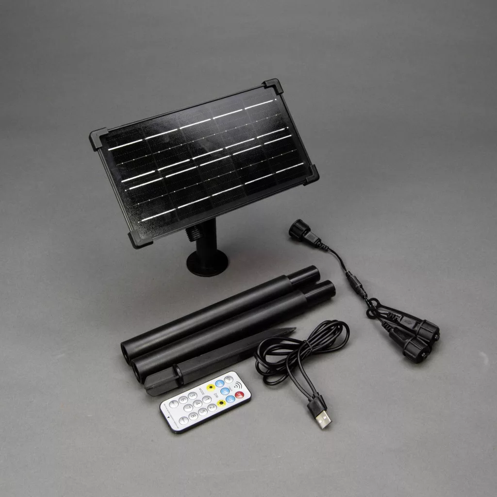 Szállítás tartalma: Napelem doboz, közepes, 4 db 18650 3,7 V típusú LiIon akkumulátor, 1 db CR2025 elem, Távirányító (IR), USB kábel, Földbe szúrható cövek, Használati útmutató