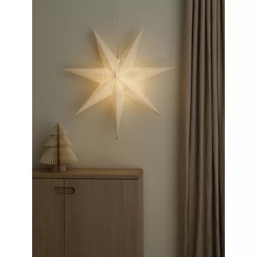 Műszaki adatok: 2021-es energiahatékonysági osztályok: n.rel. · Anyag: Papír · Felhasználási terület (karácsonyi világítás): Beltérre · Foglalat: E14 · Gyártói szín: Fehér · Karácsonyi dekoráció: Csillag · Kábelszín: Fehér · Méret, hossz: 230 mm · Méret, magasság: 800 mm · Méret, szélesség: 800 mm · Tápellátás: Hálózatról üzemeltetett · Tápkábel hossza: 5 m · Védelmi típus: IP20 · Üzemi feszültség: 230 V