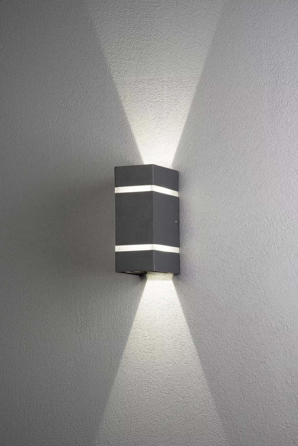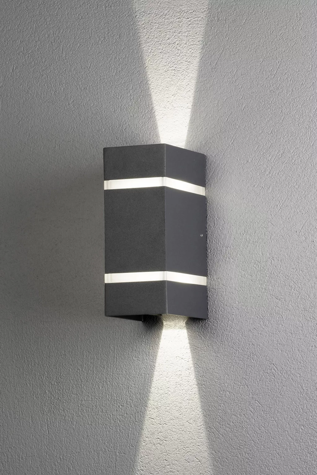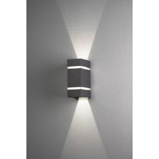 Műszaki adatok: 2021-es energiahatékonysági osztályok: F (A - G) · Anyag: Alumínium, Akril üveg · Fényforrások száma: 2 · Fényforrással: Igen · Fényszín: 3000 K · Fényszín (fényforrás): Melegfehér · Fényáram összesen: 1200 lm · Fényáram/fényforrás (lumen): 600 lm · Gyártói szín: Antracit · Helyiség: Terasz/ülősarok, Járda megvilágítás, Hangulatos kertvilágítás, Ház/garázs · Kivitel (lámpa): Derékszögű · Lámpa jellemzők: Beállítható fénykilépés, Felfelé és lefelé világít · Méret, hossz: 11.5 cm · Méret, magasság: 19.5 cm · Méret, szélesség: 8.5 cm · Teljesítmény: 6 W · Teljesítmény fényforrásonként: 3 W · Védelmi típus: IP54 · Üzemi feszültség: 230 V