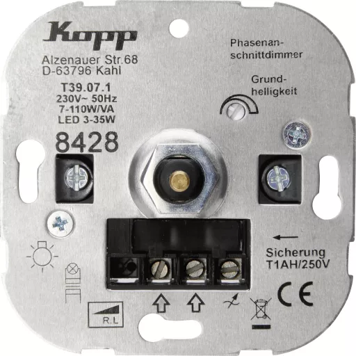 Nyomáscserélő kapcsoló - LED-es dimmer, izzólámpákhoz és 230V-os halogénlámpákhoz, csillogó LED-ekhez, valamint alacsony feszültségű halogén lámpákhoz hagyományos transzformátorokkal. Állítható alapfény, puha reteszeléssel, tengely 4 mm, fázisszög RL 7-110W / VA.