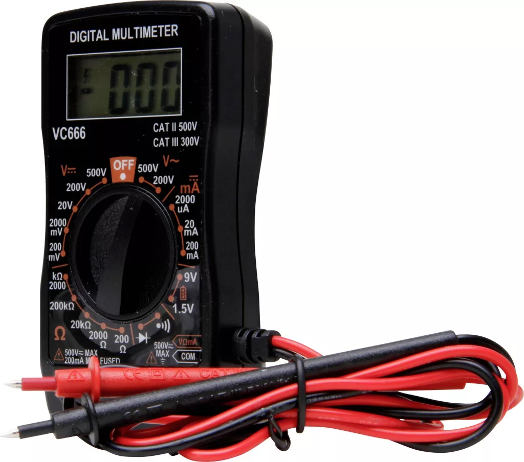7 funkciós digitális multiméter, CAT III, LCD kijelző: 15×32mm, DC feszültség: 0.2/2/20/200/200/300V ± 0.8%, AC feszültség 200/300V ± 1.2%, DC áram: 0.2m/20m/200m/200mA ± 1.0%, ellenállás: 200/2K/20K/200K/200K/2M Ohm ± 1.0%, diódateszt: teszt