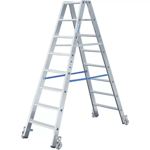Két oldalon járható alumínium többfokú létra profi felhasználáshoz · A létratartóhoz fixen rögzített, bördelezett profilú, 80 mm mély létrafokokon biztosan lehet fölmenni, és kényelmesen lehet rajtuk állni. · Két biztonsági hevederszorító, amelyek a létratartóhoz vannak hozzácsavarozva, megakadályozza a létra részeinek nemkívánt szétcsúszását · Stabil, többszörös csavarozású alumínium könyök · A kétkomponensű, csúszásmentes dugaszolható láb szavatolja a magas fokú biztonságot · A vezető- és ütődés gátló hevederszorító a 2 x 7 fokos kiviteltől szavatolja a kompakt egységet a szállításnál