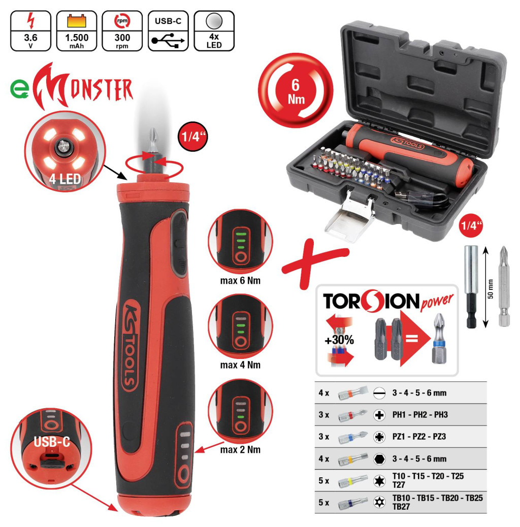eMONSTER 1/4" -os akkus bitcsavarhúzó készlet, 27 darabos, 6 Nm
