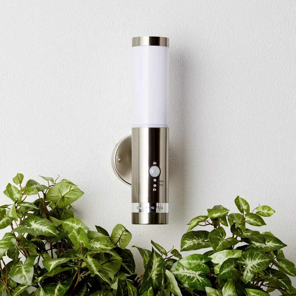 Műszaki adatok: Anyag: Fém,Műanyag · Beállítható világítási időtartam, max.: 5 perc · Beállítható világítási időtartam, min.: 5 mp · Energiahatékonysági osztály (A++ - E): Fényforrástól függ · Foglalat: E27 · Fényforrás típus: Nagyfeszültségű halogén · Fényforrások száma: 1 · Kivitel: Hengeres · Lámpa típus: Kültéri fali lámpa mozgásérzékelővel · Méret, magasság: 38 cm · Szín: Nemesacél · Teljesítmény: 60 W · Teljesítmény fényforrásonként: 60 W · Védelmi típus: IP44 · Átmérő: 6 cm · Észlelési szélesség, max.: 8 m · Üzemi feszültség: 230 V