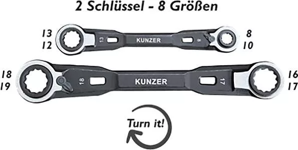 Dupla racsnis gyűrűkulcs, megfordítható és négy-négy kulccsal.
