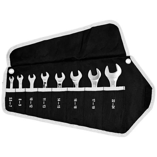 Műszaki adatok: Anyag: Acél · Anyagjellemző: Krómozott · Kulcsszélesség: 5.5 mm, 7 mm, 8 mm, 9 mm, 10 mm, 12 mm, 11 mm, 13 mm, 14 mm, 15 mm, 16 mm, 18 mm, 17 mm, 19 mm, 22 mm, 24 mm · Méret, hossz: 245 mm · Súly: 505 g