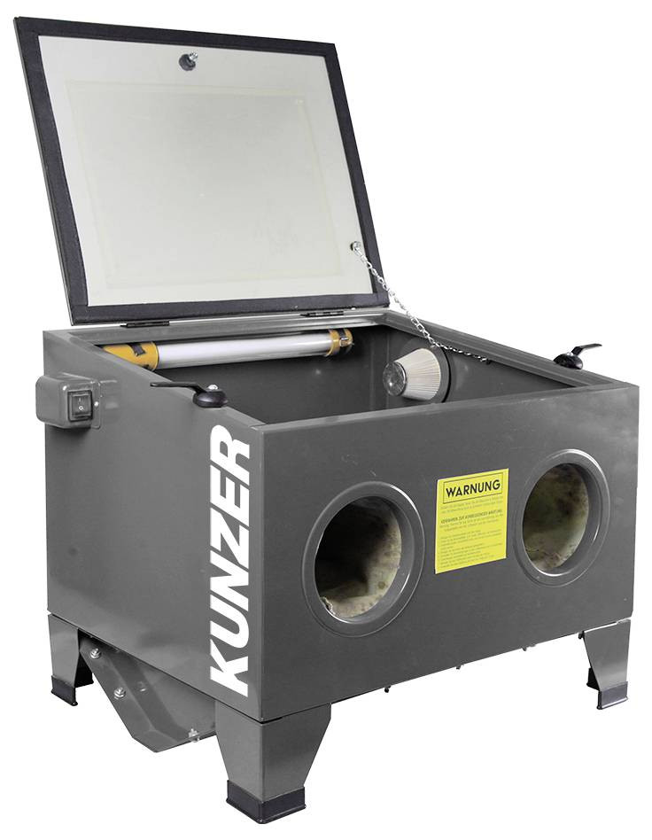 Asztali eszköz festék eltávolítására vagy mindenféle apró alkatrész tisztítására és rozsdamentesítésére, mint például felfüggesztési alkatrészek, házak vagy kis felnik. Szorosan záródó fedél és nagy betekintő ablak a tiszta és biztonságos használat érdekében. Alkalmas sokféle szórási anyaghoz, mint például üveggyöngyök, kvarchomok.