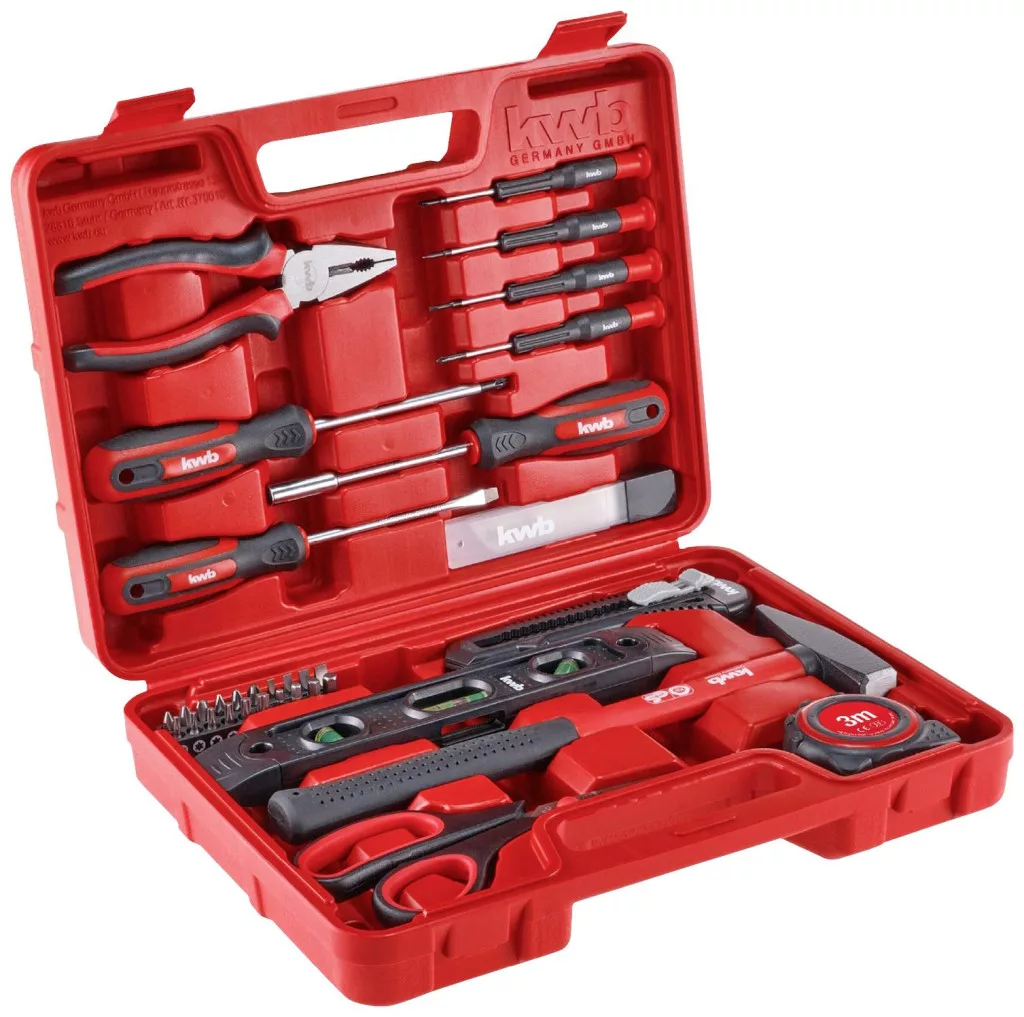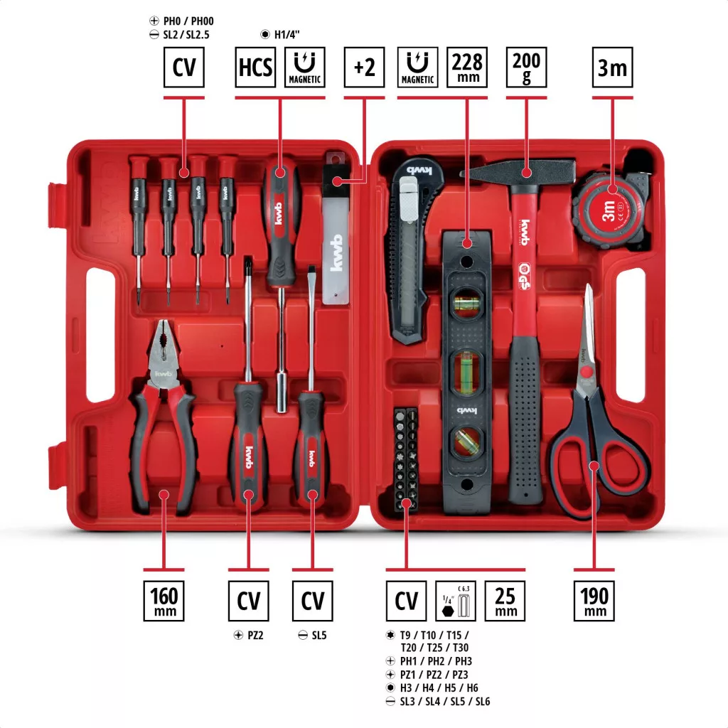 A 35 darabos, praktikus kwb szerszámtartót háztartási használatra szerelték fel. Négy precíziós csavarhúzót, egy robusztus, többfunkciós kombinált fogót, CV-acélból készült Phillips és hornyos csavarhúzókat, egy 3 m-es mérőszalagot, egy üvegszálas nyéllel szerelő kalapácsot és egy univerzális ollót tartalmaz. Egy csavarhúzó, lepattintható kés cserepengékkel, vízmérték mágnescsíkkal és bittartó sín 20 db 25 mm-es CV acél bitekkel teszi teljessé a barkácsolás szerelmeseinek készült készletet.