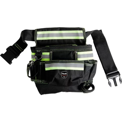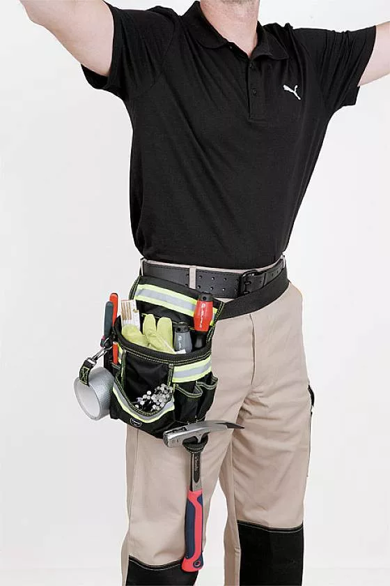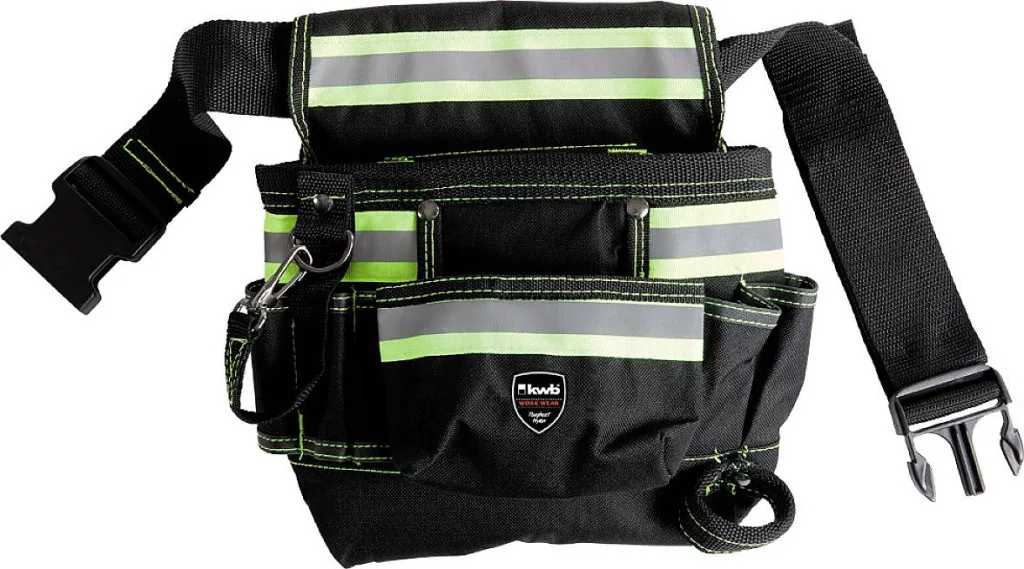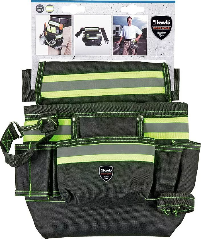 Szerszámtáska, 1 részes, 1680D nejlonból fekete színben, különösen robusztus minőség, dupla varrássor sárga szállal és fényvisszaverő biztonsági csíkokkal, nylon övvel (hossza 75-135 x 5 cm), 1 nagy szögzseb, 1 nagy rekesz 1 hurokkal, 2 keskeny rekesz, 3 csavarhúzó rekesz, 1 kalapácshurok, 1 hurok akasztóval, kwb WORK WEAR címkével, 210 x 190 x 85 mm.