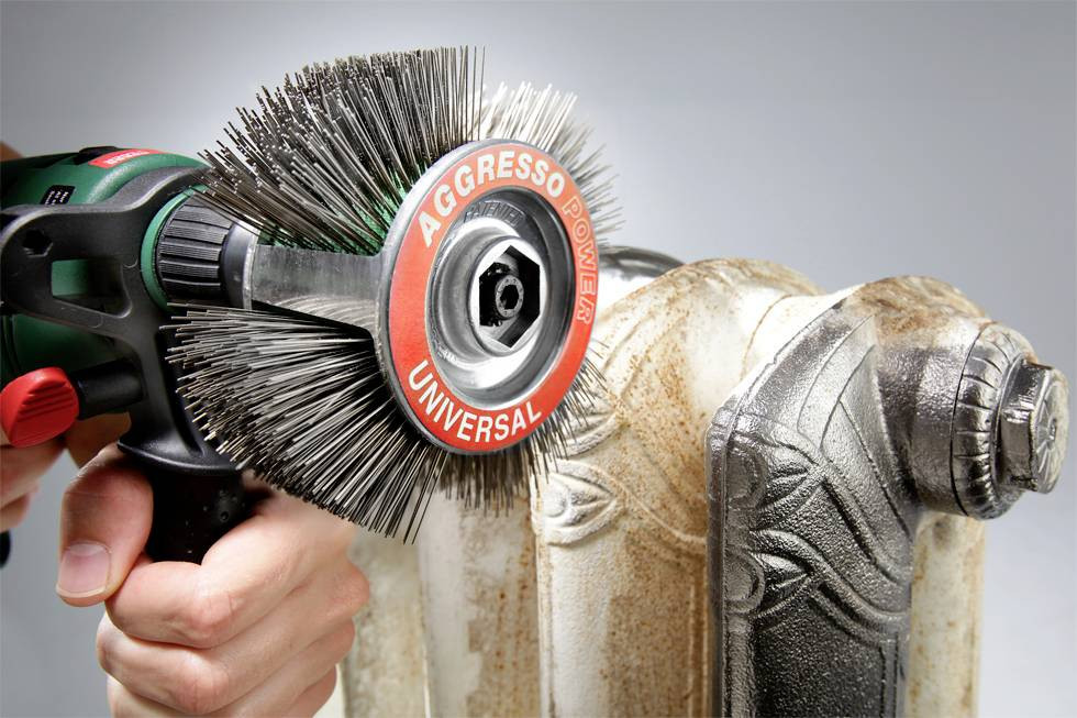 Jellemzők: AGGRESSO POWER univerzális kefe készlet, amely feszítőberendezésből, kefeövből és csapos kulcsból áll, U alakú hajlított acélhuzal, egyenes alakú, rugalmas kefeövbe ágyazva, rendkívül rugalmas, kíméletes az anyagi felületekhez, rozsdaeltávolításhoz, festékeltávolításhoz, vízkőtelenítéshez, tisztításhoz, a festék és a vastag bevonatok eltávolításához , a fa felületek durva tisztítása, a zsaluzat panelek tisztítása.