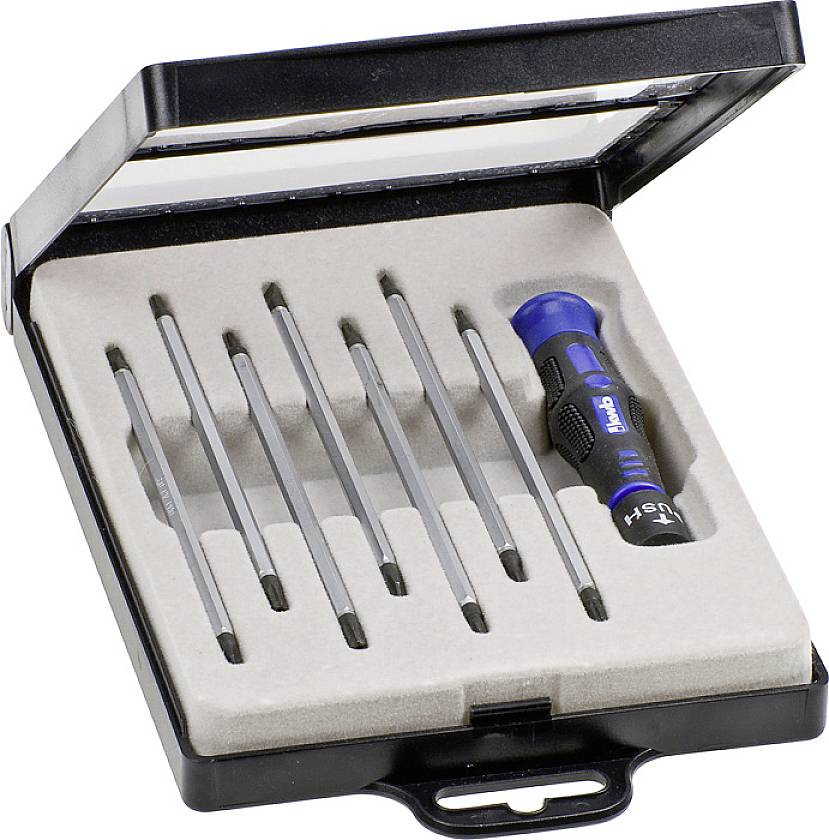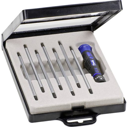 CrV acél, 2 komponensű fogantyú, forgófejjel az optimális erőátvitel és a finommechanika területén végzett könnyebb munka érdekében, cserélhető CrV acél pengékkel, matt krómozott, kékes precíziós hegyével, műanyag tokban