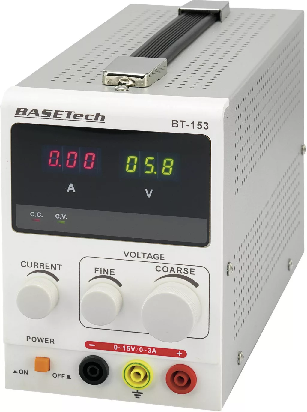 Műszaki adatok: Bemenetek: AC beépíthető tápcsatlakozó dugó IEC 320 C14 · Bemeneti feszültség: 230 V/AC · Csatlakozók: 4 mm-es banán-csatlakozóhüvellyel · Gyártói szám: BT-153 · Kalibrált: ISO · Kalibrálás: 5 kalibrált érték tartományonként VDC, VAC, ADC, AAC · Kimenetek száma: 1 x · Kimeneti feszültség (max.): 15 V/DC · Kimeneti feszültség (min.): 0 V/DC · Kimeneti áram (max.): 3 A · Kivitel: Asztali számítógép · Min. kimeneti áram: 0 A · Méret, hossz: 245 mm · Méret, magasság: 155 mm · Méret, szélesség: 105 mm · Súly: 2.4 kg · Technológia (tápegység): Lineárisan szabályozott · Teljesítmény: 45 W · Termék típus: Labortápegység, szabályozható · Tápegységtípus: Lineáris
