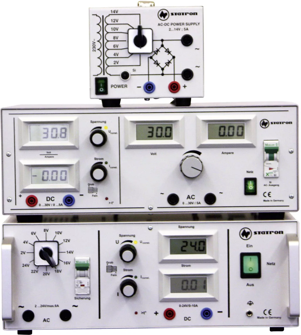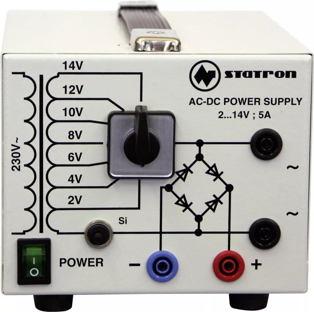 A Statron univerzális hálózati tápegységek tömör felépítésüknek és kiemelkedő ár-teljesítmény viszonyuknak köszönhetően főleg az iskolai oktatásban és a kiképzés területén ajánlottak. A 2 - 14 V között átkapcsolható kimeneti feszültség AC feszültségként, vagy a beépített hídegyenirányítón keresztül DC feszültségként külön biztonsági hüvelyeken levehető. A biztonságot az EN 61010 és 60950 szabványok betartása garantálja.