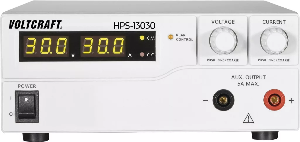 A nagyteljesítményű tápegység primer kapcsolóüzemű, és ezáltal nagyon kompakt. A kimeneti feszültség az elülső oldalon 4 mm-es biztonsági hüvelyeken keresztül 5 A-ig, és a hátoldali nagyáramú kimeneten a maximális áramig levehető.