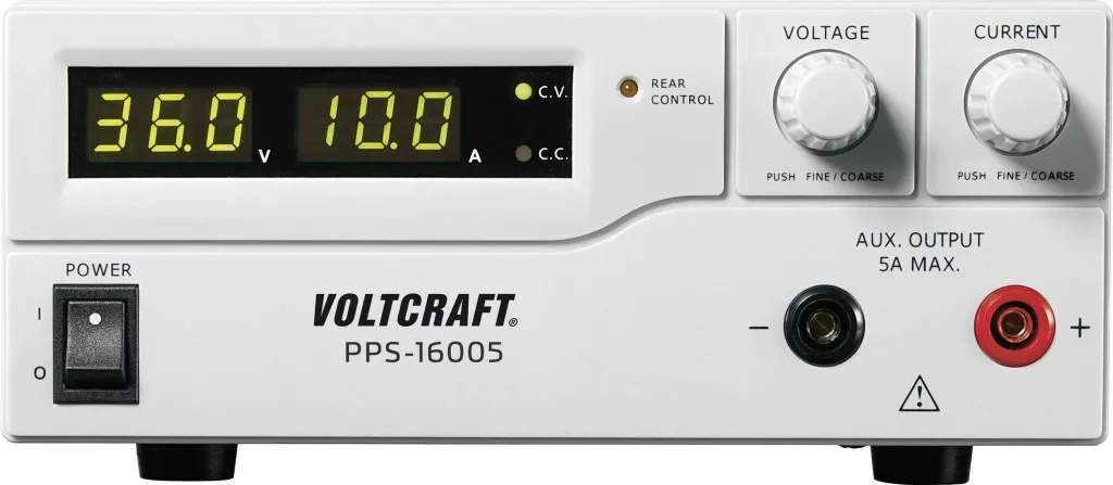 A PPS sorozat labortápegységei potenciálfüggetlen DC feszültségforrásként szolgálnak kisfeszültségű fogyasztók üzemeltetéséhez. A beállítható kimenet az elülső oldalon max. 5 A-ig, és a hátoldalon a teljes névleges áramerősségig (1 - 36 V/DC / 0 - 5 A) kihasználható. A csatlakozás az előlapon 4 mm-es biztonsági aljakon keresztül, a hátoldalon nagyáramú csavaros szorítókon keresztül történik. A feszültség és az áram beállítását fokozatmentesen végezheti egy digitális forgószabályzó segítségével, durva- és finombeállítással, a gyors és precíz érték beállítása érdekében. Az értékek a jól áttekinthető kijelzőn jelennek meg. Az áramhatárolás az állandó áramú működéshez rövidzárlat híd nélkül előre beállítható.