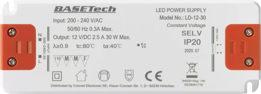 Műszaki adatok: Bemeneti feszültség (max.): 240 V/AC · Bemeneti feszültség (min.): 220 V/AC · Certifikációk: SELV Class II · Csatlakozó (építőelem): Csavaros kapocs · Hőmérséklet (max.): 40 °C · Hőmérséklet (min.): 0 °C · Kimeneti áram (max.): 2.5 A · Kivitel (LED meghajtó): Állandó feszültségű · LED meghajtó jellemzők: Bútorhoz alkalmas,Túlfeszültség kategória,,Gyúlékony felületekre szerelhető · Méret, hossz: 160 mm · Méret, magasság: 18 mm · Méret, szélesség: 58 mm · Súly: 137 g · Teljesítmény (max.): 30 W · Védelmi osztály: II,EMV · F · MM,IP20 · Üzemi feszültség: 12 V/DC