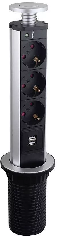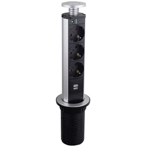 Műszaki adatok: Alkalmazás helye: Beltér · Anyag: Alumínium/műanyag · Csatlakozási teljesítmény: 4000 W · Dugaljak száma: 3 · Gyártói szín: Alumínium, Fekete · Hálózati elosztó jellemzők: Süllyeszthető, USB-vel, Kapcsolóval · Mennyiség megadása: 3 részes · Méret, magasság: 340 mm · Szerelési mód: Beépíthető, Asztali · Védelmi típus: IP20 · Átmérő: 100 mm · Üzemi feszültség: 230 V