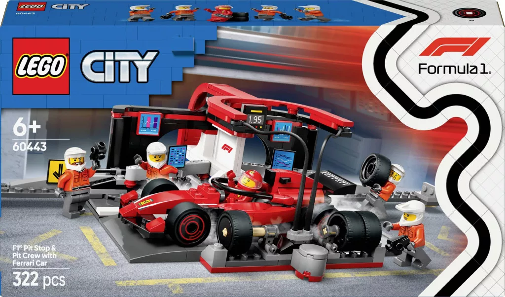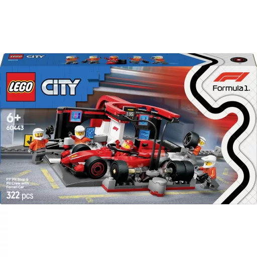 A LEGO City F1 Pit Stop a Pit Crew-val és a Ferrari Speedsterrel (60443) egy gyors tempójú építő- és játékkészlet, amely lehetővé teszi, hogy a 6 éves és annál idősebb gyermekek megtapasztalják az igazi Forma-1-es versenyzés izgalmát. Ez a készlet mindent tartalmaz, amire a gyerekeknek szükségük van a villámgyors bokszkiállásokhoz: friss slickeket, ütvecsavarozókulcsokat és egy bokszcsapatot, amely egy kapcsoló elfordításával a villámgyors gumicseréhez megfelelő pozícióba állítható. Egy Forma-1-es Ferrari versenyautó és 5 minifigura (1 versenyző és 4 szerelő) lehetővé teszi a fiatal motorsport-rajongók számára, hogy izgalmas boxkiállásokat ábrázoljanak.