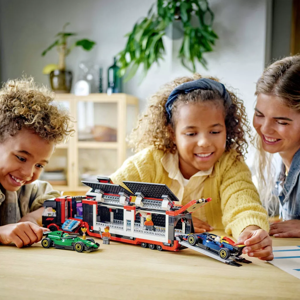 Ajándékot keresel egy fiatal Forma-1-rajongónak? A LEGO City F1 Transporter RB20 és AMR24 F1 versenyautókkal egy nagyszerű prémium játékkészlet 8 éves és annál idősebb gyermekek számára. Ennek a játékautószállítónak a levehető utánfutóján egy F1-es szimulátorszoba és egy dupla rakodótér található teljesen lehajtható oldalfalakkal. A gyerekek felhajthatják a csomagtérajtót, és kihúzhatják a rakodó rámpákat, hogy megrakják a két F1-es versenyautót – az RB20-at és az AMR24-et. Ezen kívül 5 minifigura (2 versenyző és 3 boksz-legénység), valamint egy győztes kupa izgalmas szerepjátékokba invitál a versenypályán és környékén.