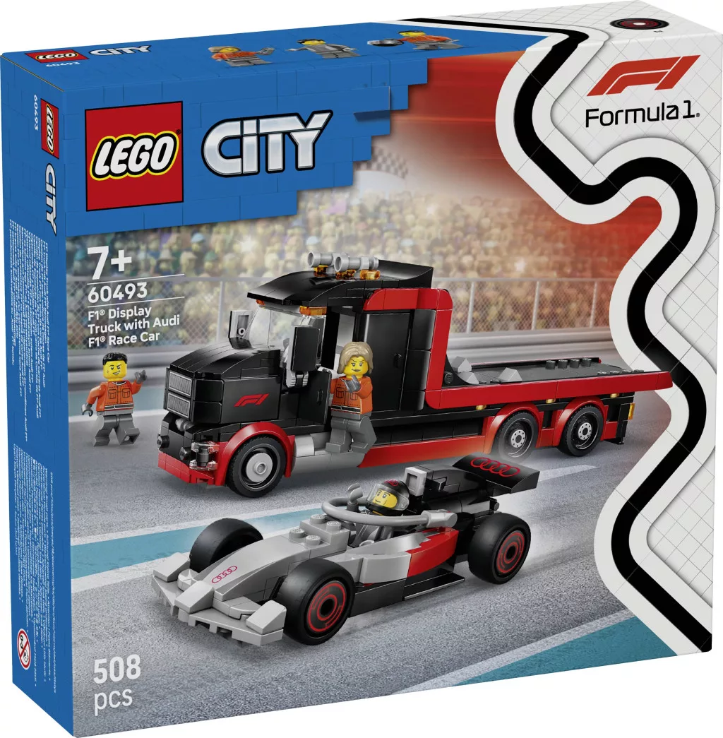 A LEGO® City F1® teherautó Audi F1® versenyautóval (60493) számos izgalmas versenyre repíti a 7 éves és annál idősebb motorsport-rajongókat. A prémium építőkészlet tartalmaz egy eredeti Audi F1® versenyautót slick karosszériával és részletesen kidolgozott pilótafülkével, valamint egy teherautót vezetőfülkével, tárolórekeszekkel, motortérrel, 6 gumiabronccsal és egy emelőplatformmal az Audi F1® játékversenyautó kirakodásához. Három LEGO minifigura és az F1 kiegészítő elemek lehetővé teszik a gyerekek számára, hogy fantáziadúsan játsszanak, majd kiállítsák a modelleket. Az egyik minifigura vezeti az Audit, a másik kettő a boxutcában dolgozók egyike.