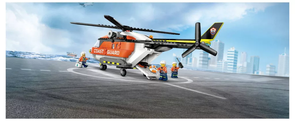 Egy parti őrség helikoptere, egy mentőkapszula, 4 minifigura és egy cápa játékra csábít.