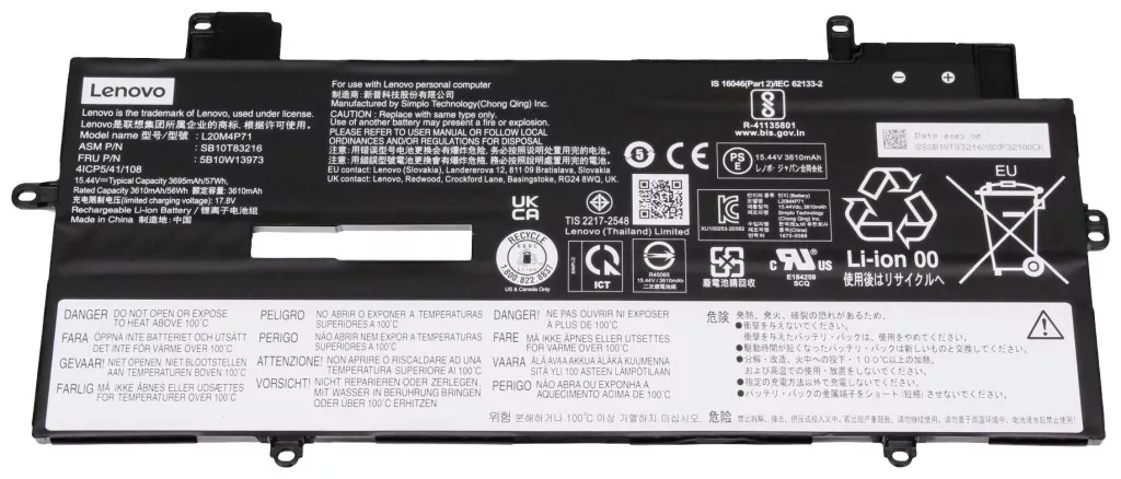 Műszaki adatok: A következő márkákhoz alkalmas: Lenovo · Alkalmas: Lenovo ThinkPad X1 Carbon G10 (21CC), Lenovo ThinkPad X1 Yoga 7th Gen (21CD/21CE), Lenovo ThinkPad X1 Carbon G10 (21CB), Lenovo ThinkPad X1 Carbon 9th Gen (20XW/20XX), Lenovo ThinkPad X1 Yoga 6th Gen (20XY/20Y0), Lenovo ThinkPad X1 Carbon Gen 11 (21HM/21HN), Lenovo ThinkPad X1 Yoga Gen 8 (21HQ/21HR) · Elem- és akku csoport (csak keresőhöz): Egyéb · Elem- és akkuméret: Speciális akku · Elem-/akkutechnológia: Lítiumion · Eredeti akku: 5B10W13975, 5B10W13974, 5B10W13973, SB10T83218, L20C4P71 · Felhasználási területek: Notebook · Feszültség: 15.44 V · Kapacitás (mAh, Ah): 3695 mAh · További műszaki adatok: Energia 57 Wh · Újratölthető: Igen