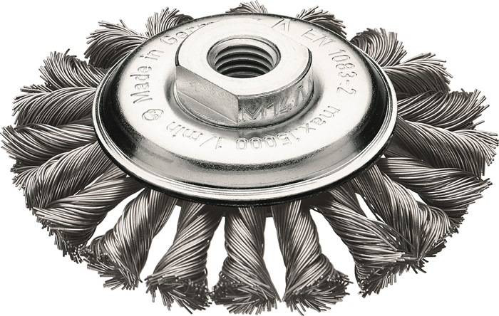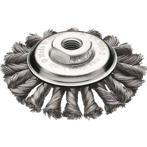 fonott drót · Felváltva jobbra/balra csavarni · nehezen elérhető helyek feldolgozására salak, rozsda, vízkő, festék stb. eltávolítására. · ideális sarkokhoz és élekhez · sarokcsiszolókhoz · Nagyon agresszív kefe nagyon hosszú élettartammal · M14 Egyéb műszaki jellemzők: · Max. sebesség: 15000perc-¹