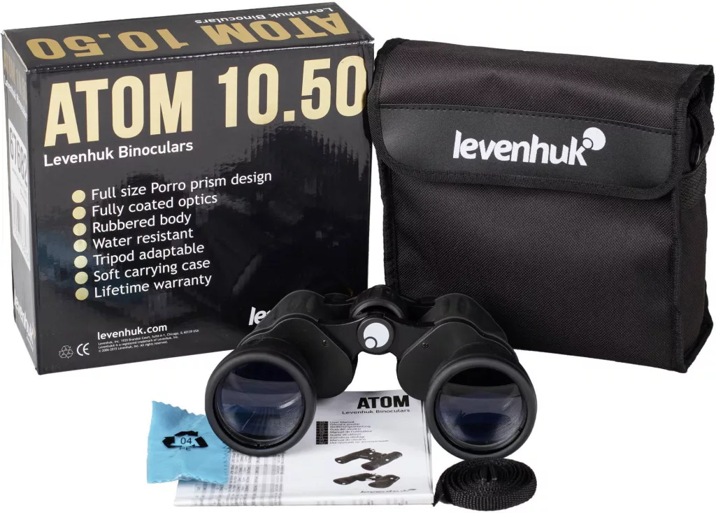 Levenhuk Atom 10x50 távcső: a szemlencséhez: 12 mm -Relatív fényerő: 25 - Látómező: 7 fok - Látómező m / 1000: 115 m - Közeli fókusz: 16 m - Dioptria beállítása a szemlencsén: ± 3 dioptria - Pupilláris távolság (IPD) ): 56 - 72 mm - Gumi szemhéjak - Méretek: 198 x 180 x 65 mm