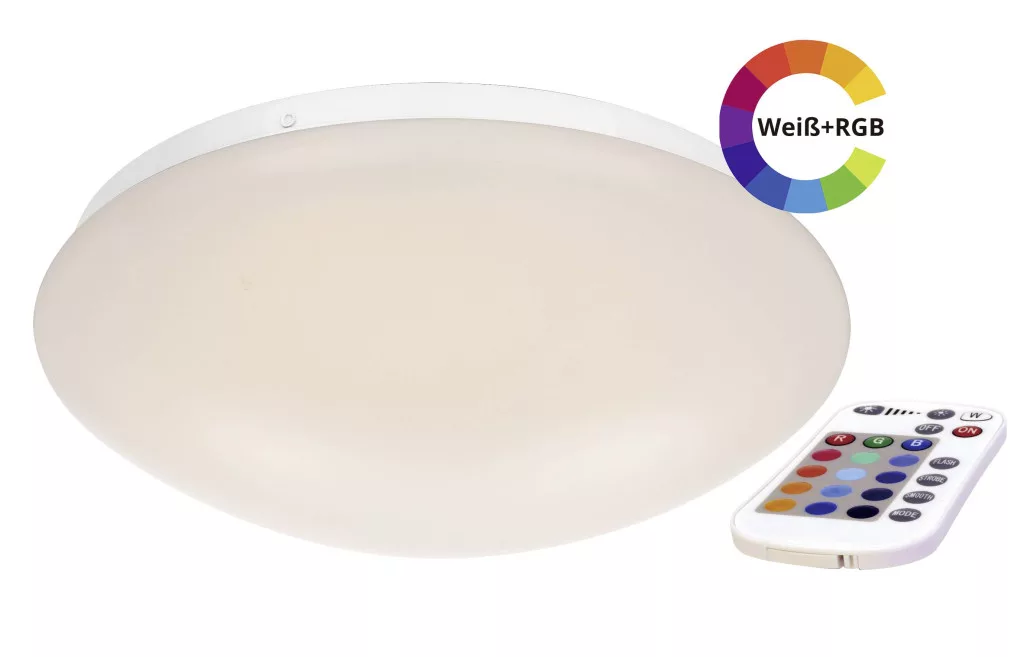 Műszaki adatok: 2021-es energiahatékonysági osztályok: n.rel. · Anyag: Műanyag · Energiafogyasztás: 15 kW/1000 óra · Fényforrással: Igen · Fényszín: 2700 K · Fényszín (fényforrás): RGBW · Fényáram összesen: 1000 lm · Gyártói szín: Fehér · Kivitel (lámpa): Kerek · Lámpa jellemzők: Beállítható fényszín, Dimmelhető, Távirányítóval · Méret, magasság: 10 cm · Súly: 500 g · Teljesítmény: 15 W · Átmérő: 33.5 cm · Üzemi feszültség: 230 V