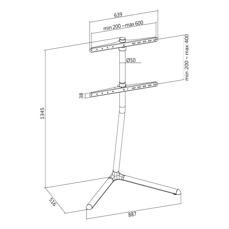 Műszaki adatok: Alkalmas a következő kijelző méretekhez: 124,5 cm (49"), 127,0 cm (50"), 129,5 cm (51"), 132,1 cm (52"), 134,6 cm (53"), 137,2 cm (54"), 139,7 cm (55"), 142,2 cm (56"), 144,8 cm (57"), 147,3 cm (58"), 149,9 cm (59"), 152,4 cm (60"), 154,9 cm (61"), 157,5 cm (62"), 160,0 cm (63"), 162,6 cm (64"), 165,1 cm (65"), 167,6 cm (66"), 170,2 cm (67"), 172,7 cm (68"), 175,3 cm (69"), 177,8 cm (70") · Gyártói szín: Fekete · Gáznyomásos technológia: Nem · Méret, magasság: 1345 mm · Méret, mélység: 887 mm · Méret, szélesség: 516 mm · Súly: 8500 g · Tartó kivitel: Padlóállvány · Tartóerő (max.): 40 kg · VESA szabvány: 200 x 200 mm, 300 x 200 mm, 300 x 300 mm, 400 x 200 mm, 400 x 300 mm, 400 x 400 mm, 600 x 400 mm