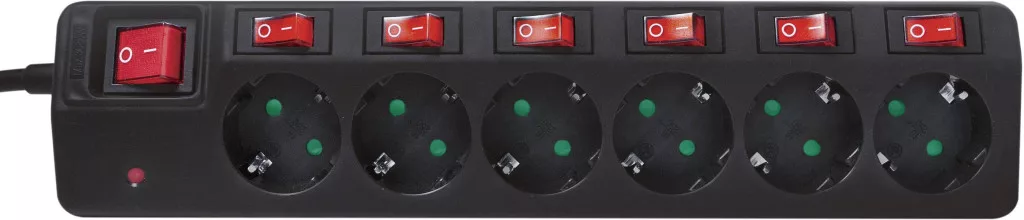Műszaki adatok: Alkalmazás helye: Beltér · Anyag: Műanyag · Csatlakozási teljesítmény: 3680 W W · Dugaljak száma: 6 · Gyártói szín: Fekete · Hálózati csatlakozó típus: Védőérintkezős · Hálózati elosztó jellemzők: Egyenként kapcsolható, Gyermekvédelem · Kábel típus DIN/VDE szerint: H05VV-F 3G 1,5 mm² · Kábelhossz: 1.50 m · Méret, hossz: 320 mm · Méret, magasság: 70 mm · Méret, szélesség: 35 mm · Működés jelző: Optikai · Védelmi típus: IP20 · Üzemi feszültség: 230 V