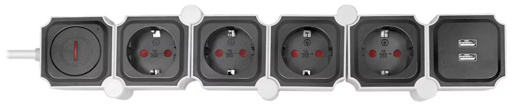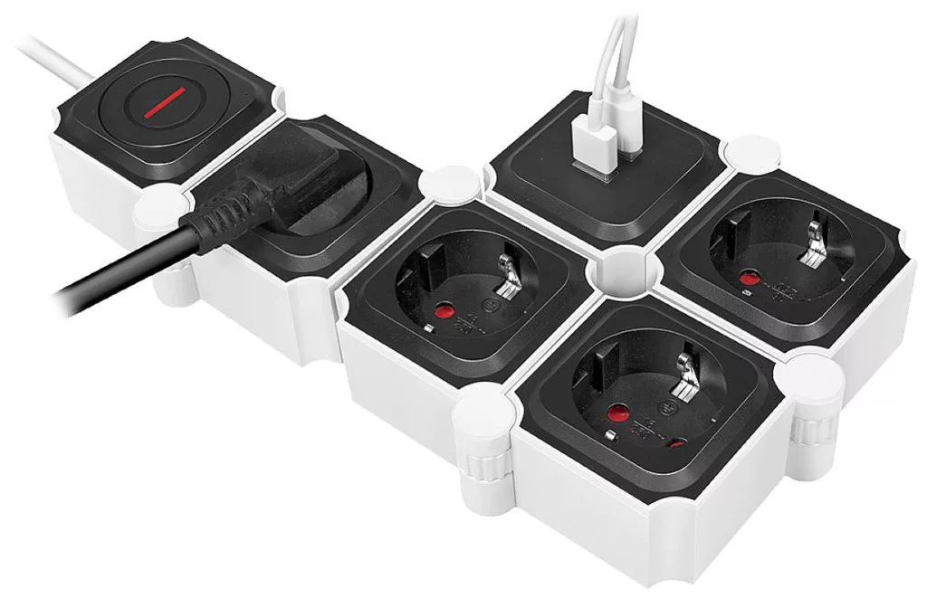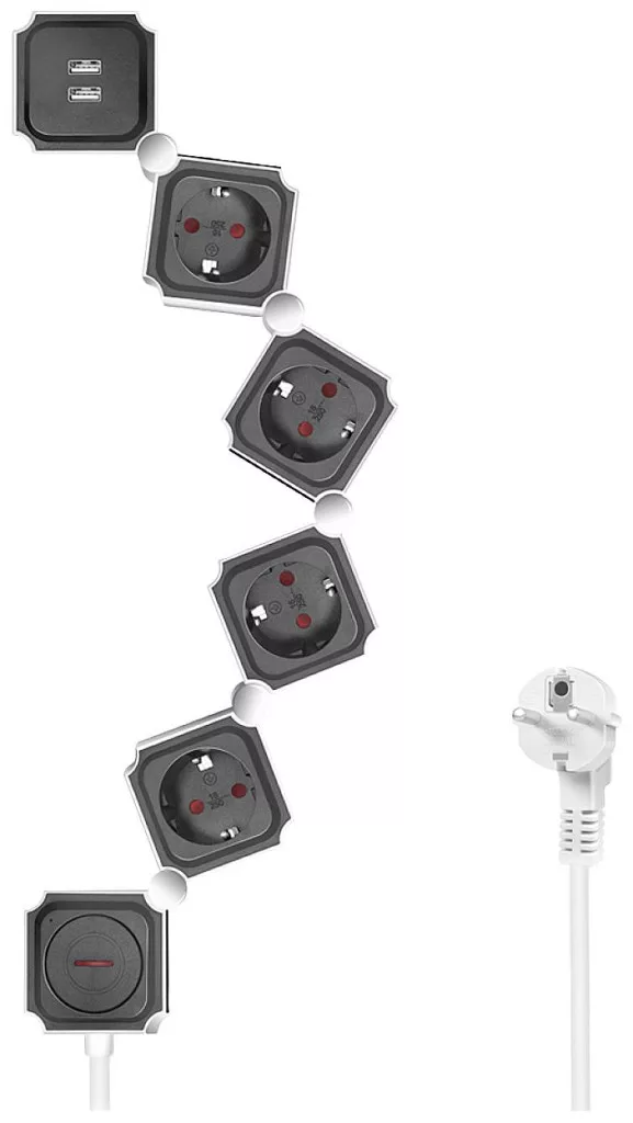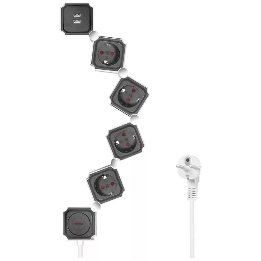 Ez a rugalmas elosztó 4 konnektorral és 2 USB gyorstöltő porttal rendelkezik. A forma 180°-ban változtatható különböző irányokba, és tetszőleges formára hajlítható, például a bútorok köré és szűk helyekre való illeszkedéshez.