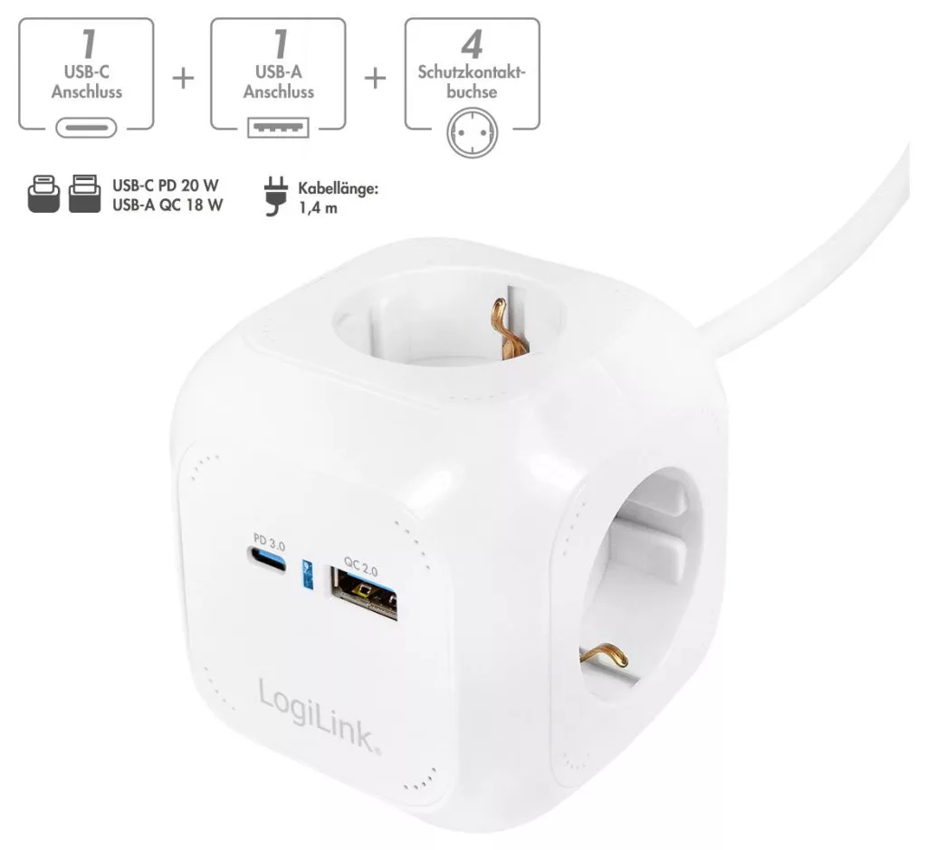 Technical specifications: Alkalmazási terület: Beltér,Aljzat dugó · Dugaljak száma: 4 · Hálózati csatlakozó típus: Védőérintkezős · Hálózati elosztó jellemzők: USB-vel,#####mit USB-C®,#####Power Delivery · Kábelhossz: 1.40 m · Méret, hossz: 75 mm · Méret, magasság: 75 mm · Méret, szélesség: 94.3 mm · Szín: Fehér · Védelmi típus: IP20