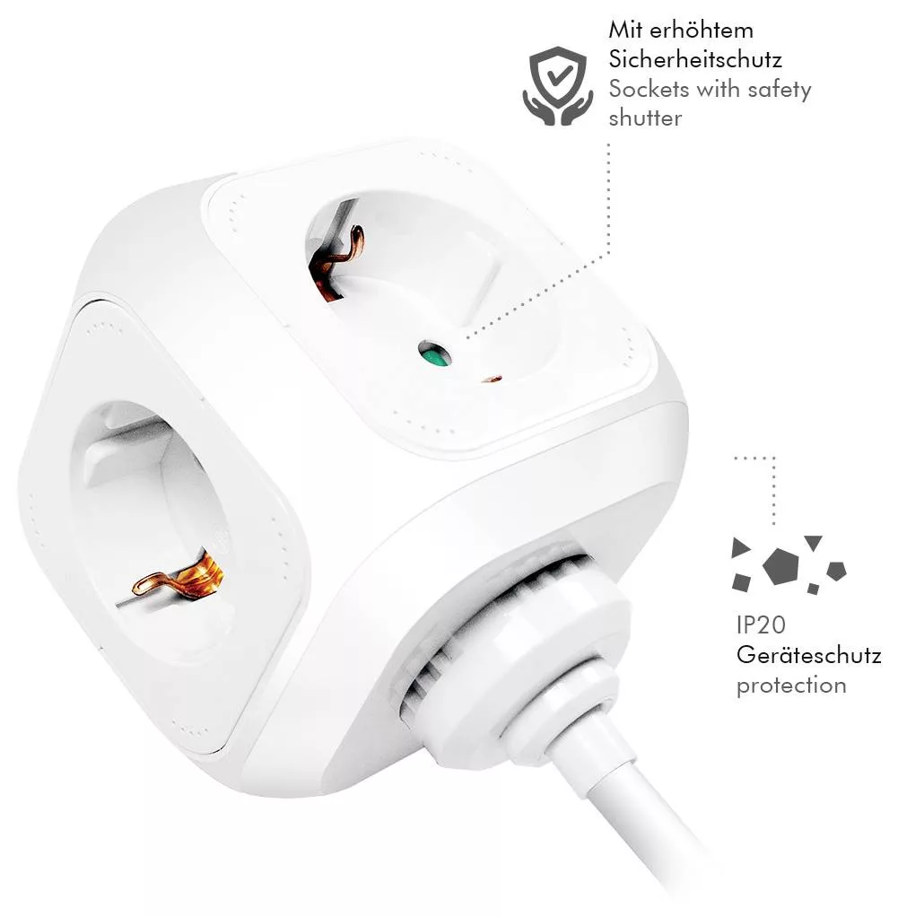A Power Cube több, mint egy elosztó. Ez egy igazi mindenes, ami megkönnyíti az életedet. 4 aljzatával, USB-C PD 20W és USB-A QC 18W portjaival maximális rugalmasságot és teljesítményt kínál eszközei töltésekor. Legyen szó okostelefonról, tabletről, laptopról, lámpáról vagy ventilátorról – minden megtalálja a helyét. A praktikus fali/asztali állványnak köszönhetően a Power Cube-ot bárhová rögzítheti, ahol szüksége van rá. Így mindig kéznél lesznek az eszközeid, és értékes helyet takaríthatsz meg az asztalodon vagy a munkafelületeden.