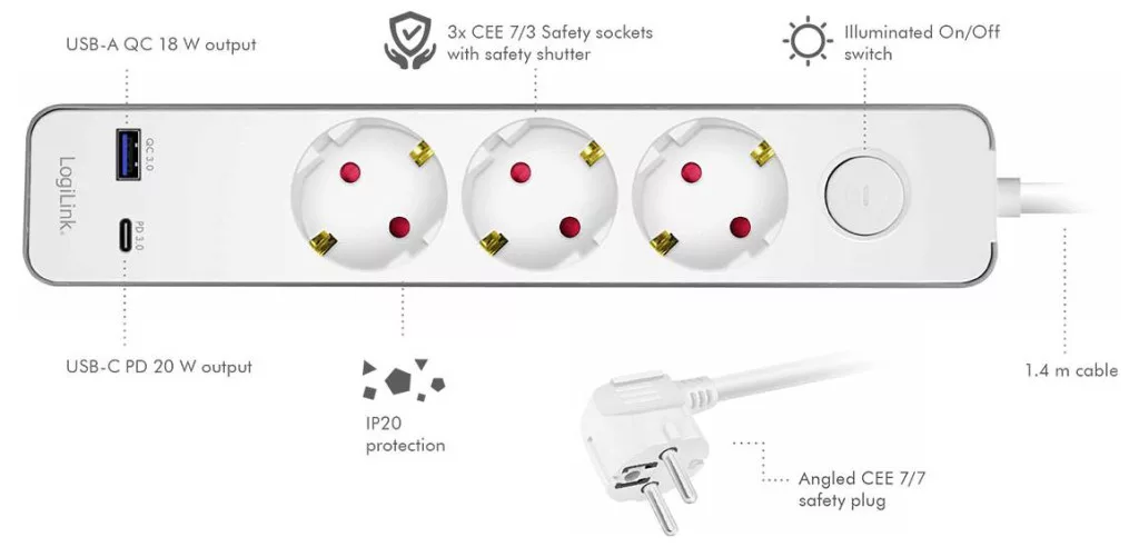 A LogiLink LPS287U 3 utas elosztó ideális megoldás otthoni vagy irodai eszközök kényelmes áramellátásához és gyors töltéséhez. Három biztonsági aljzattal és két gyorstöltő USB-porttal (1x USB-C PD 20 W és 1x USB-A QC 18 W) akár öt eszközt is tölthet egyszerre. Ez az elosztó maximális biztonságot nyújt a túlterhelésvédelemnek és a fokozott érintésvédelemnek köszönhetően, és 1,4 m hosszú kábelének köszönhetően rugalmasan használható.