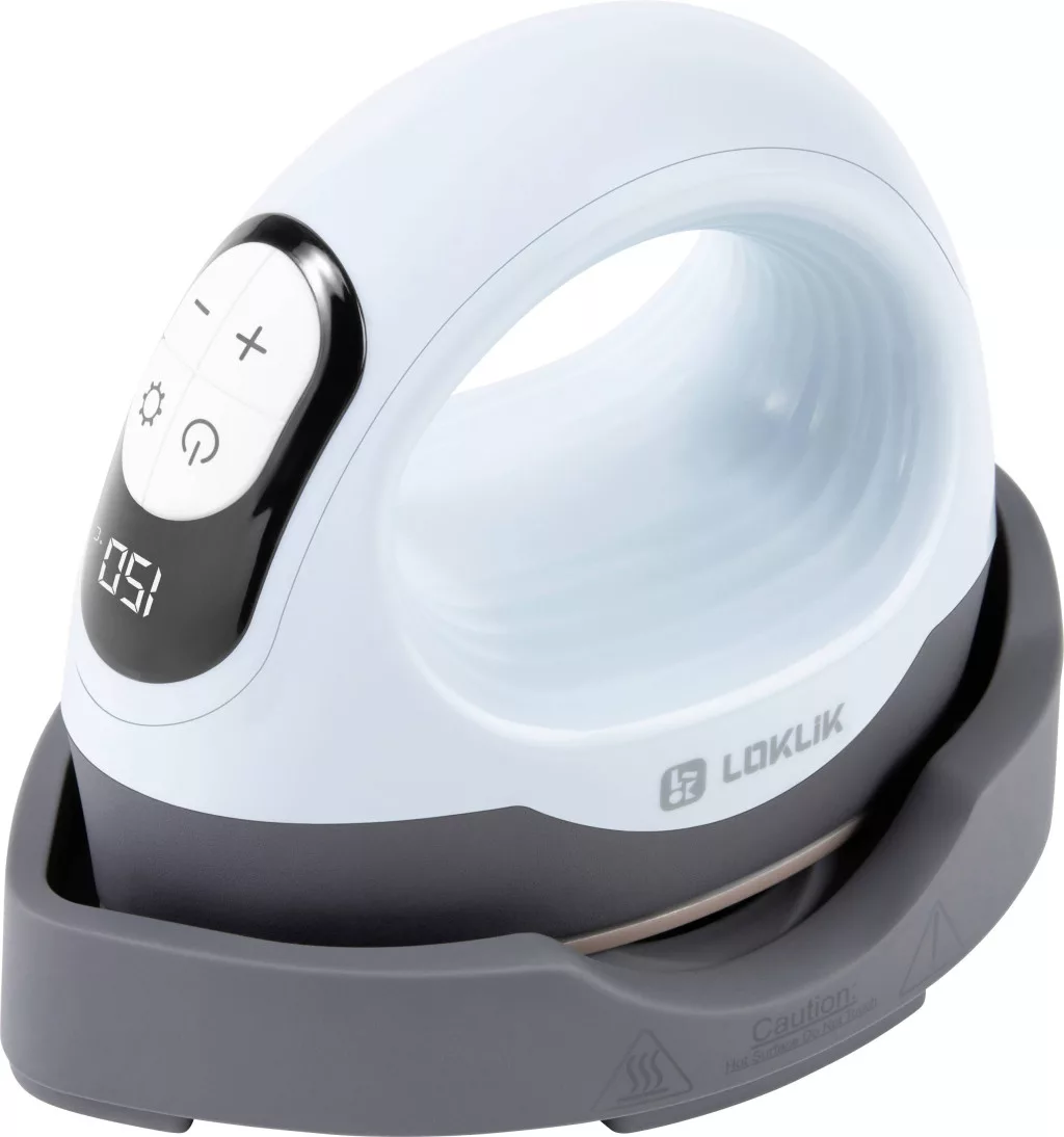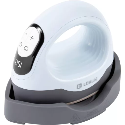 Intuitív képernyőVilágos beállítások: A LOKLiK ImPress™ Mini 3 intuitív, fejjel lefelé fordított kijelzőjét az egyszerűség és a kényelem jegyében tervezték. Tisztán megjeleníti a hőmérsékletet és az időzítő beállításait, és segít ezek nyomon követésében vasalás közben.