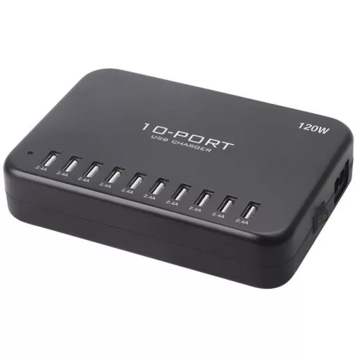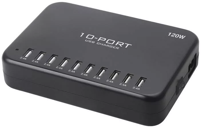 Műszaki adatok: Alkalmas: Universal · Alkalmazás helye: Beltér · Bemenetek (dugótípus): Euro dugó · Bemeneti feszültség (num): 100 V/AC, 240 V/AC · Bemeneti feszültség tartomány: 100 - 240 V · Gyártói szín: Fekete · Kimenetek: 10x USB-A · Kimenetek száma: 10 x · Kimeneti feszültség: 5 V · Kimeneti áram (max.): 24000 mA · Kimeneti áram (max.) csatornánként: 2400 mA · Méret, hossz: 156 mm · Méret, magasság: 33 mm · Méret, szélesség: 109 mm · Súly: 465 g · Teljesítmény: 120 W