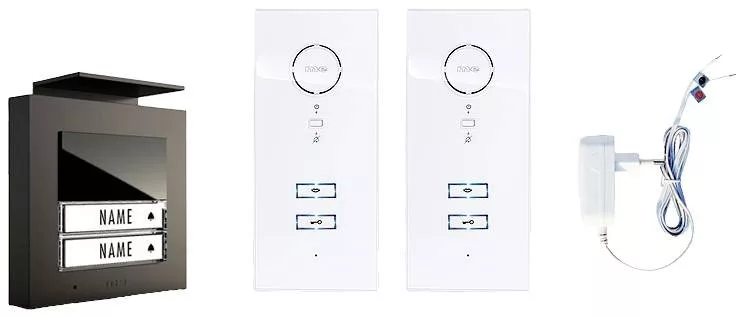 Műszaki adatok: Anyag (kültéri egység): Alumínium · Dallamok száma: 16 · Gyártói szín: Antracit, Fehér · Hangrendszer összetevők: Komplett készlet · Kaputelefon jellemzők: Világító névtábla, 2 db belső egységgel · Kábelhossz (max.): 100 m · Méret (belső): 88x200x21 mm · Méret (külső készülék): 114x114x30 mm · Szerelési mód (belül): Falra szerelhető · Szerelési mód (kívül): Falra szerelhető · Szám (egységek/résztvevők): 2 · Tápellátás: Hálózatról üzemeltetett · Átviteli mód: Vezetékes
