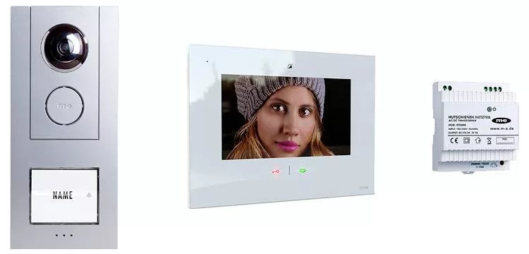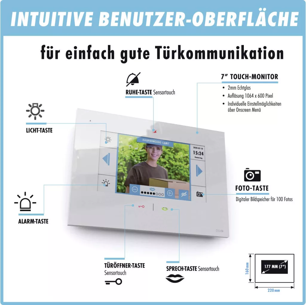 Technical specifications: Hangrendszer összetevők: Komplett készlet · Kaputelefon jellemzők: Világító névtábla · Kijelző típus: Érintőkijelző · Képernyő Ø (col): 7 Zoll · Látószög, vízszintes: 120 ° · Méret (belső): 220 × 160 × 28 mm · Méret (külső készülék): 77 × 97 × 56 mm · Szerelési mód (belül): Falra szerelhető · Szerelési mód (kívül): Falra szerelhető · Szín: Fehér (fényes),Ezüst