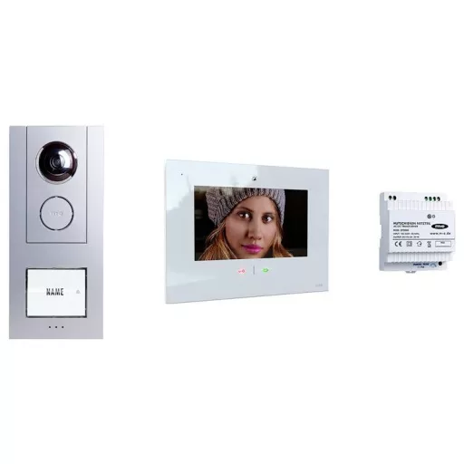 Package contents: 1x VD-ALU 610 S kültéri állomás (ezüst),1x VDV-907 iP beltéri egység fehér színben,1x DIN sínre szerelhető tápegység DT-2000