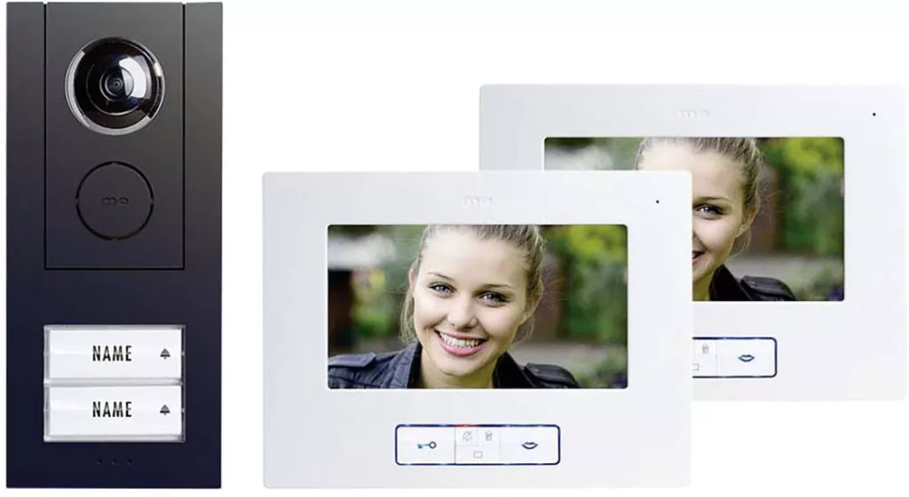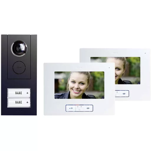Videóajtó kaputelefon 2 család számára, két 17,7 cm (7 ") beltéri állomással, ajtónyitó jelzéssel és kaputelefon funkcióval. Kültéri állomás kiváló minőségű, öntött alumínium házban, antracit védőbevonattal