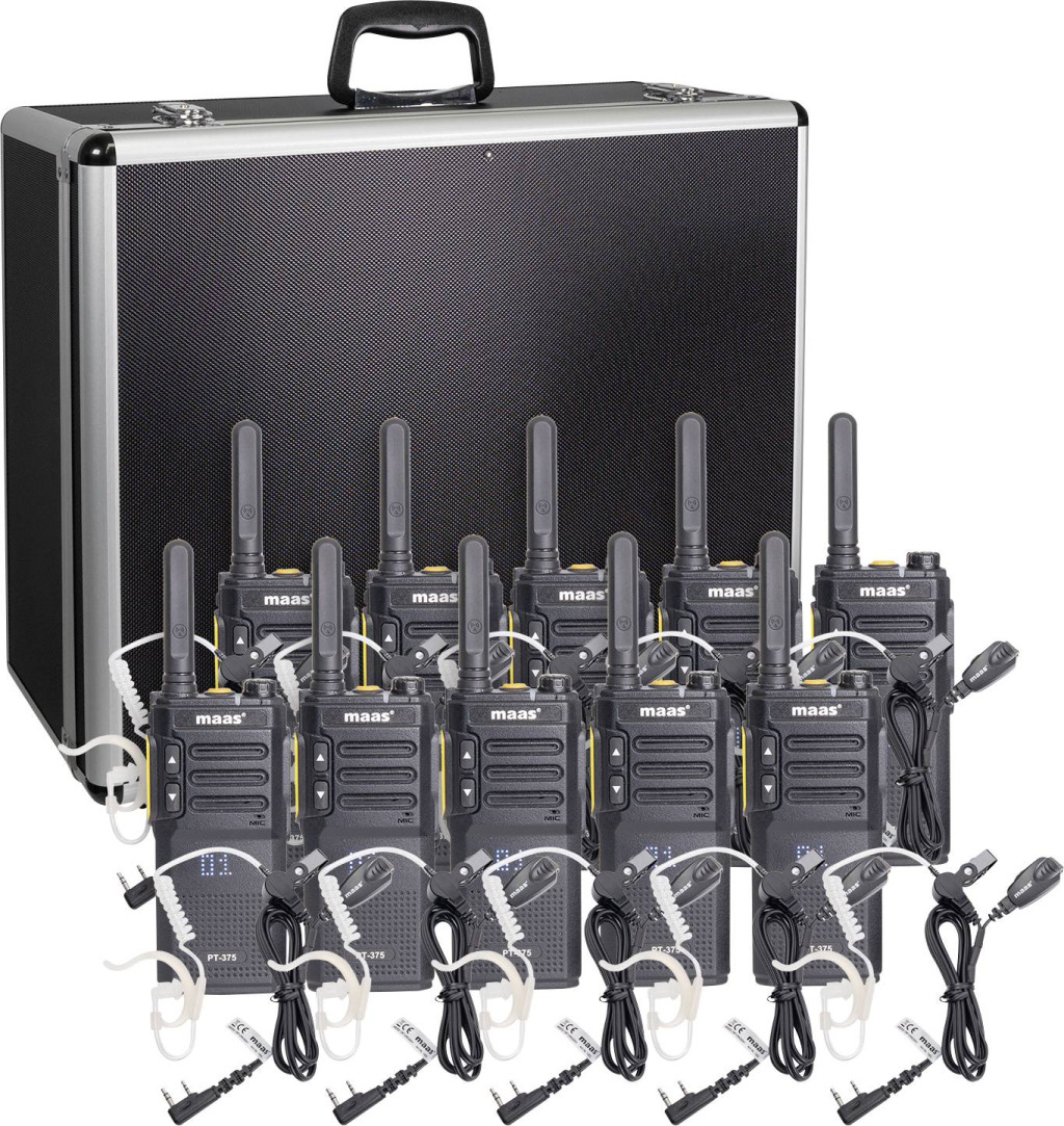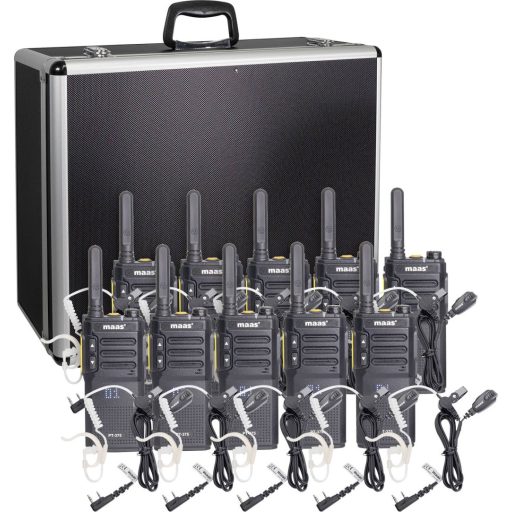 Package contents: 10 db MAAS PT-375 rádió,10 db KEP-24-VK biztonsági fejhallgató,10 x újratölthető Li-ion akkumulátor (3,7 V / 2300 mAh),Állványtöltő (egyenként készülékekhez vagy akkumulátorokhoz),tápadapter micro-USB kábellel,Övcsíptetők,Robusztus alumínium tok pontosan illeszkedő habszivacs betéttel.