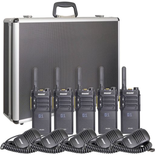 MAAS 5 részes csapatkészlet PT-375 KEP-360-K rádiótokbanA MAAS 5 részes csapatkészlet ideális teljes megoldást kínál a megbízható és rugalmas rádiókommunikációra támaszkodó csapatok számára. Ez a készlet öt kompakt MAAS PT-375 PMR446 rádiót és öt KEP-360-K hangszórómikrofont tartalmaz, amelyek praktikus kialakításukkal és robusztus tulajdonságaikkal lenyűgözőek. Mindent biztonságosan és áttekinthetően tárolunk egy kiváló minőségű alumínium tokban – tökéletes professzionális használatra, legyen szó rendezvényekről, biztonsági szolgáltatásokról, szabadtéri tevékenységekről vagy az iparról.