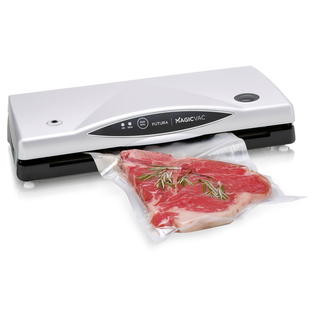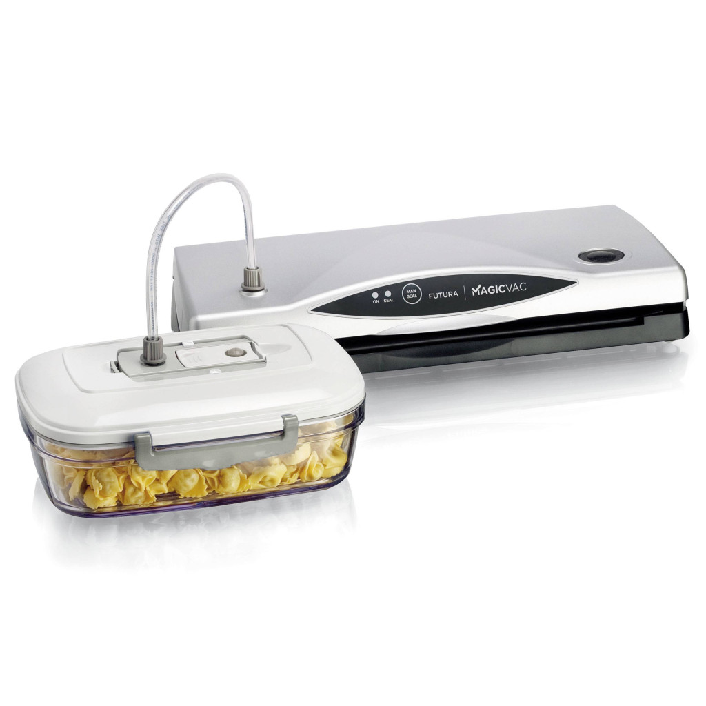 A MAGICVAC Futura vákuumtömítő egy elegáns és könnyen tisztítható megoldás az élelmiszerek tartósítására. A teljesen automatikus ciklussal és a kényes ételekhez kézi ciklussal a vákuumzár optimális frissességet és eltarthatóságot biztosít. A készüléknek van egy ciklusa is a tartályokban vákuum létrehozására, valamint egy LED-kijelző a tömítés folyamatához.